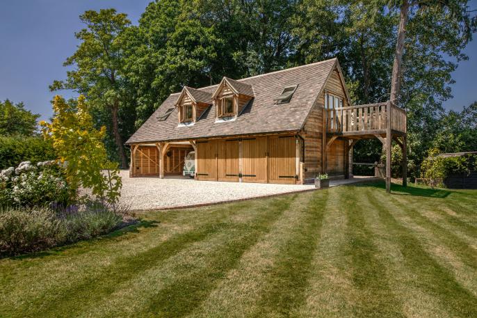 eiken bijgebouw met carport en houten garage voor aston martin