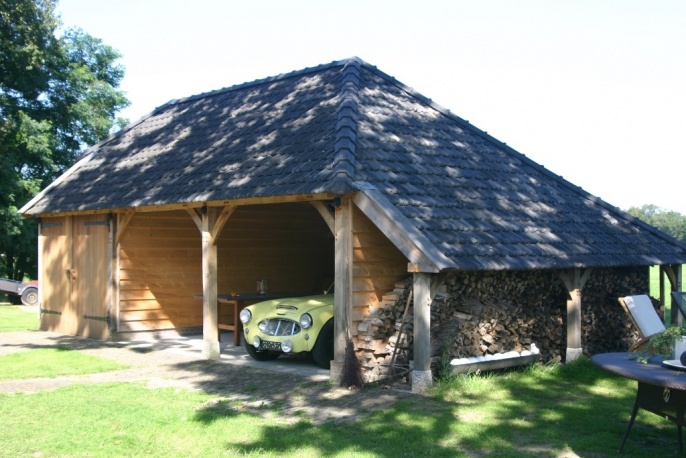 eikenhouten bijgebouw met carport en houten garage voor austin healey oldtimer