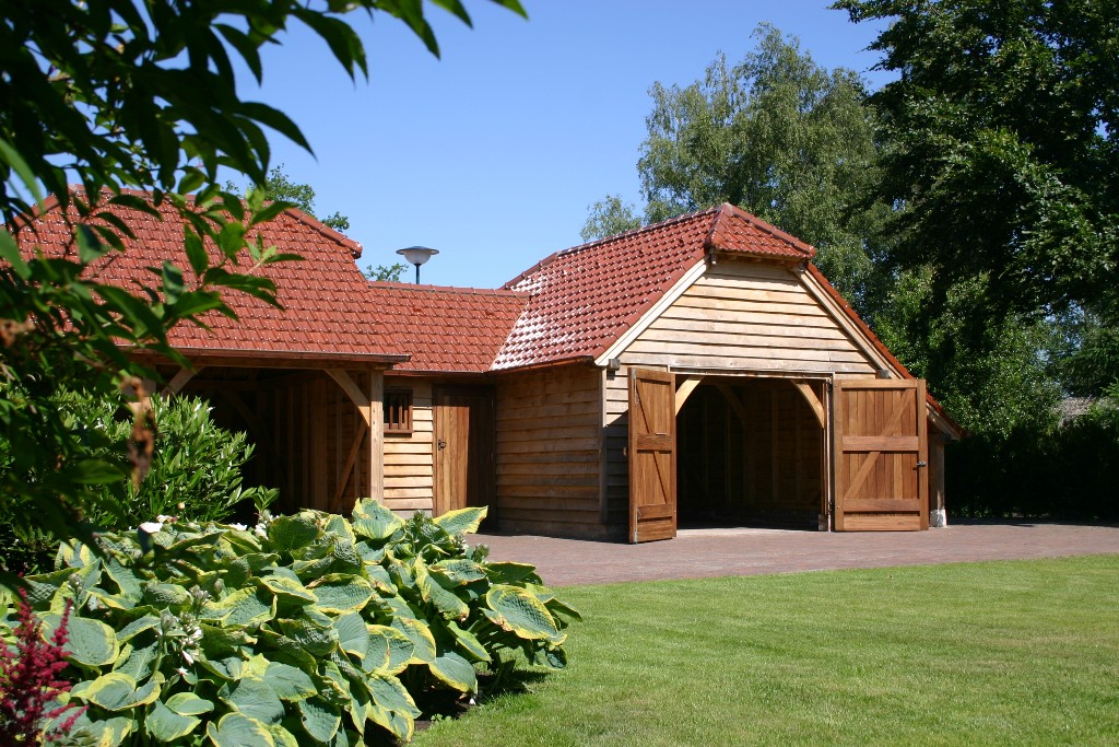 Eiken bijgebouw met garage en veranda met keramische kruispannen en duurzame eiken potdeksel gevel. Garage voorzien van iroko garage deuren.