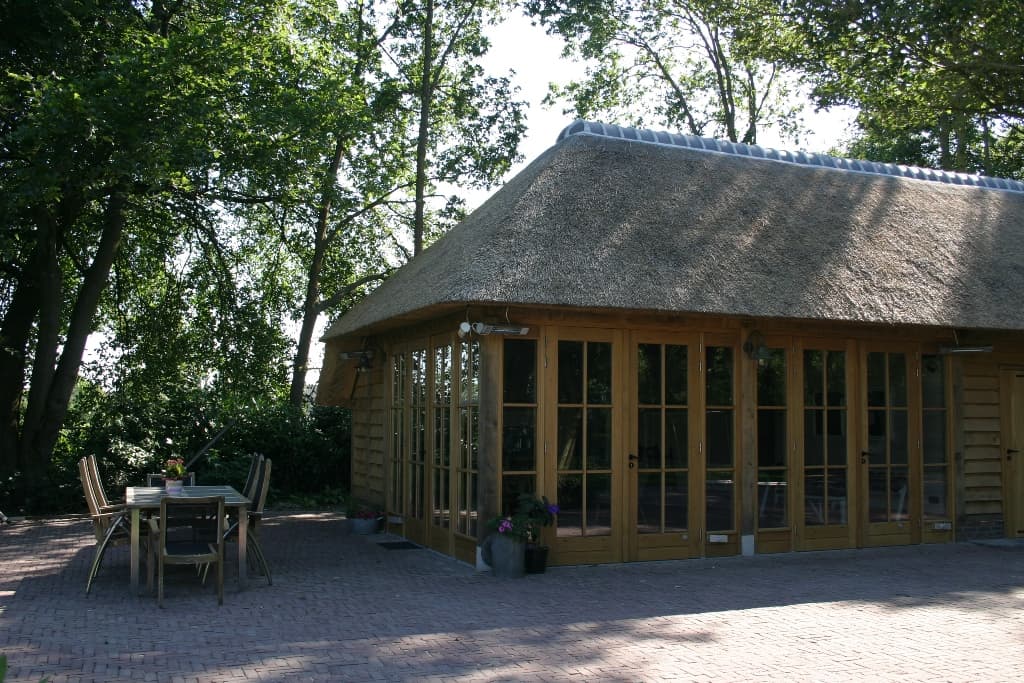 Traditioneel eiken bijgebouw voorzien van openslaande terrasdeuren. Het dak is gedekt met eerste kwaliteit riet en de gevel is voorzien van gepotdekselde eiken delen.