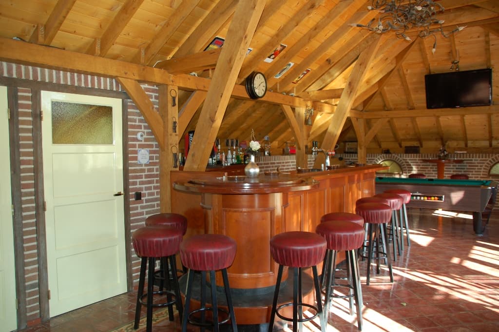 Eiken bijgebouw dat is ingericht als thuisbar. De constructie is uitgevoerd met een boog gebint om een ruimtelijk gevoel te creëren. Het gebouw is voorzien van een tap en een poolbiljart.