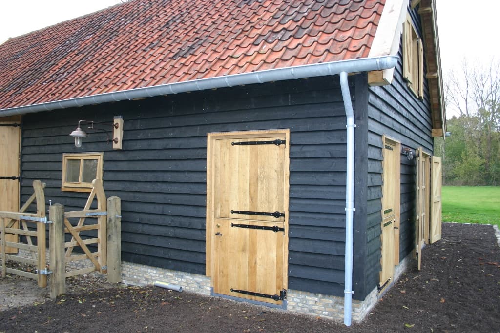 De brede zwarte gevelplanken zijn handmatig gespijkerd. De gevel is voorzien van een prachtige gevellamp en op maat gemaakte eiken deuren.