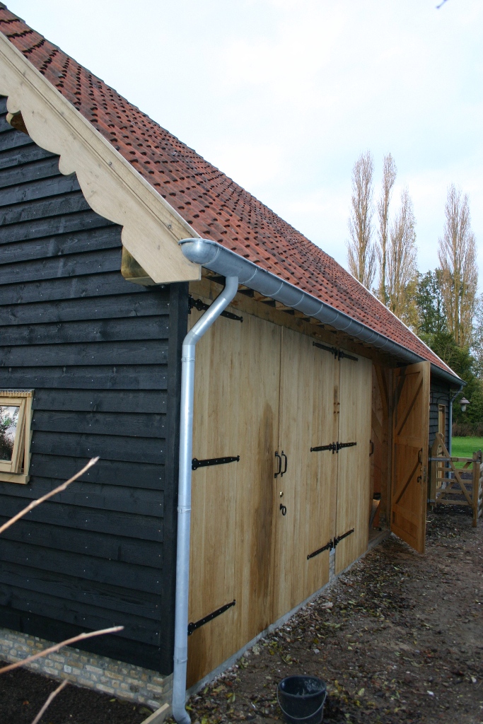Eiken bijgebouw met garage en eiken windveren en eiken luitken. Gebouwd bij een monument op een ladgoed.