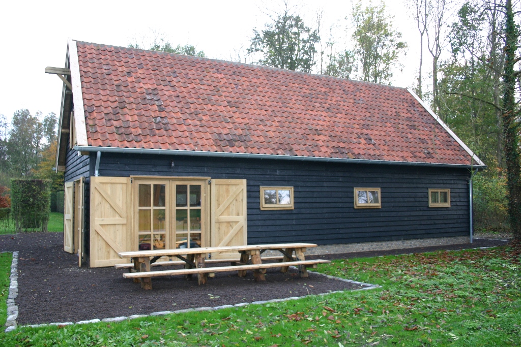 Dit eikenhouten bijgebouw met garage, luiken en windveren biedt een sfeervol gastenverblijf dat perfect past bij een historisch landgoed.