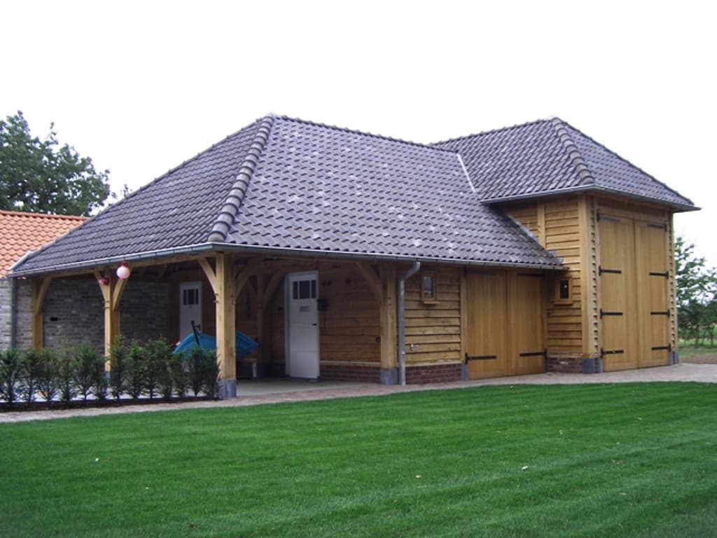 Eiken bijgebouw met eiken gevel bij zwembad, voorzien van berging, slaapzolder, werkplaats en stalling voor de camper.
