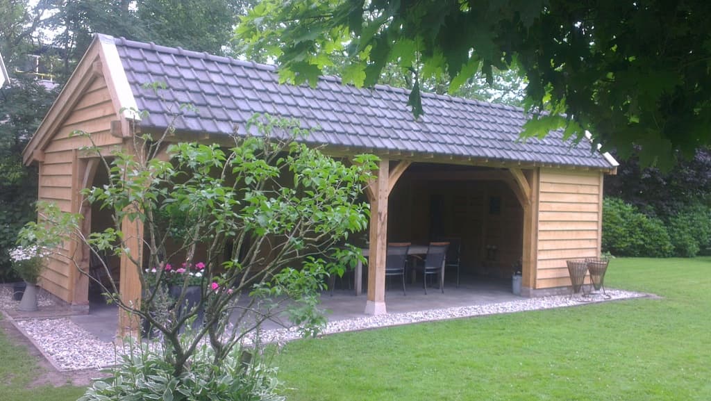 Eiken bijgebouw als kapschuur model met eiken frame en eiken gevelbekleding.