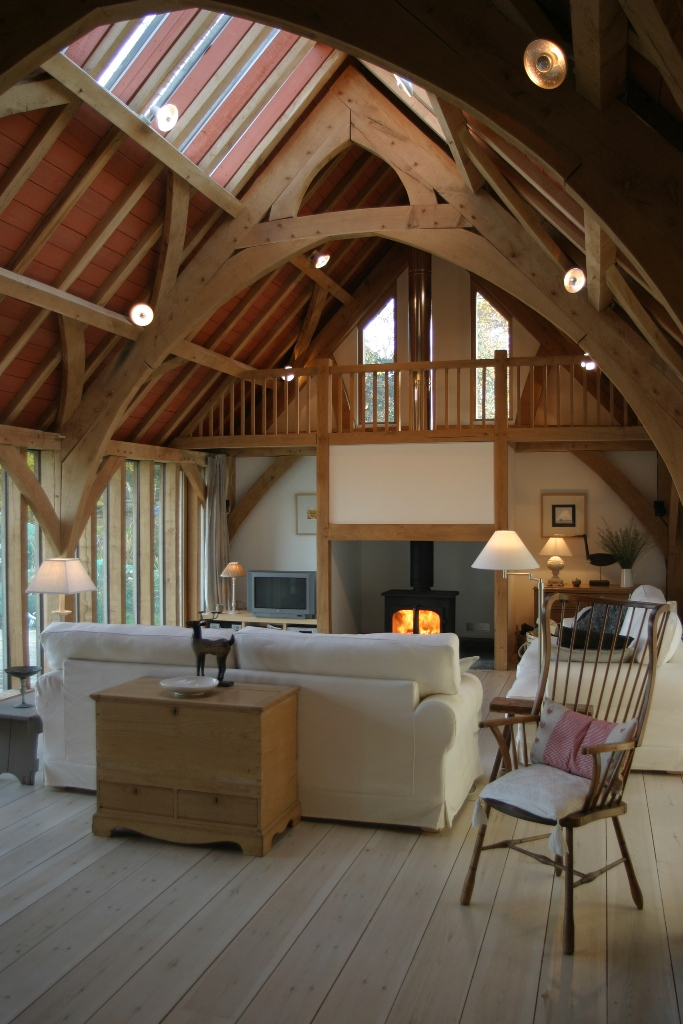 eiken bijgebouw als houten aanbouw aan vakantiewoning voorzien van arch-frame en houtkachel.