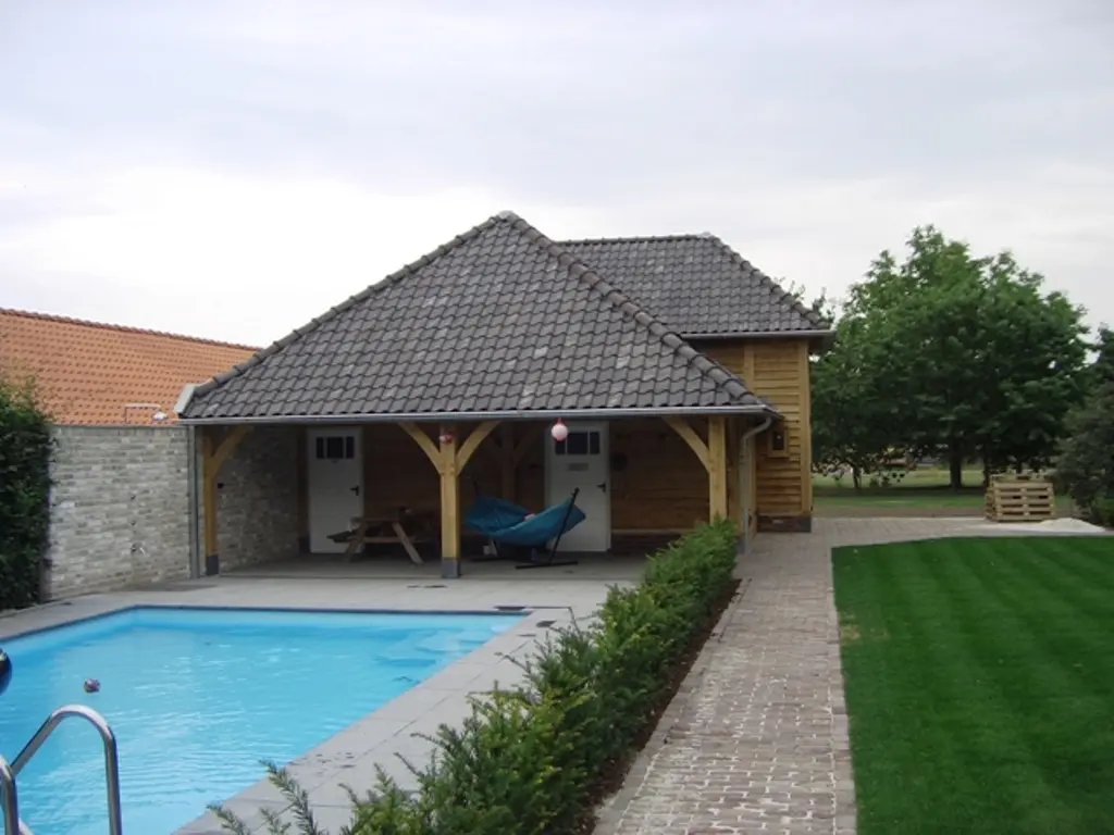 Eiken bijgebouw met eiken poolhouse bij bouwkundig zwembad met gastenverblijf.