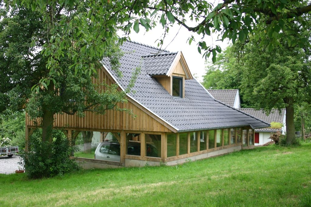 eiken bijgebouw met gastenverblijf en atelier, houten berging en 3 stuks carport gevel van leemstuc