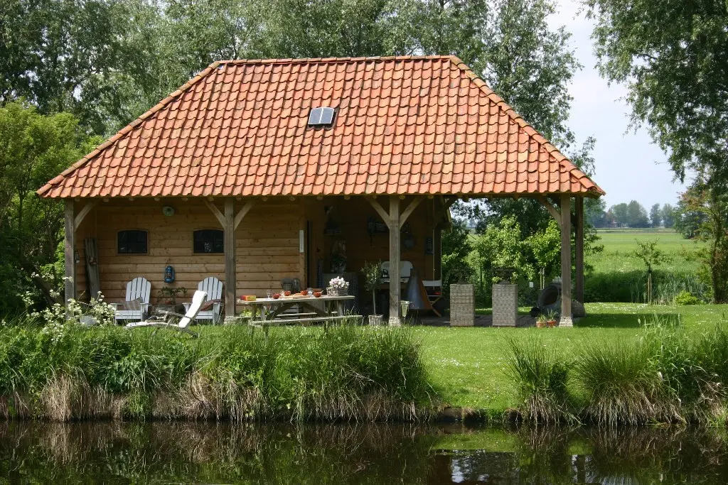 Eiken Bijgebouw met berging en veranda bij Friese boerderij het dak voorzien van ronde “Juffers”