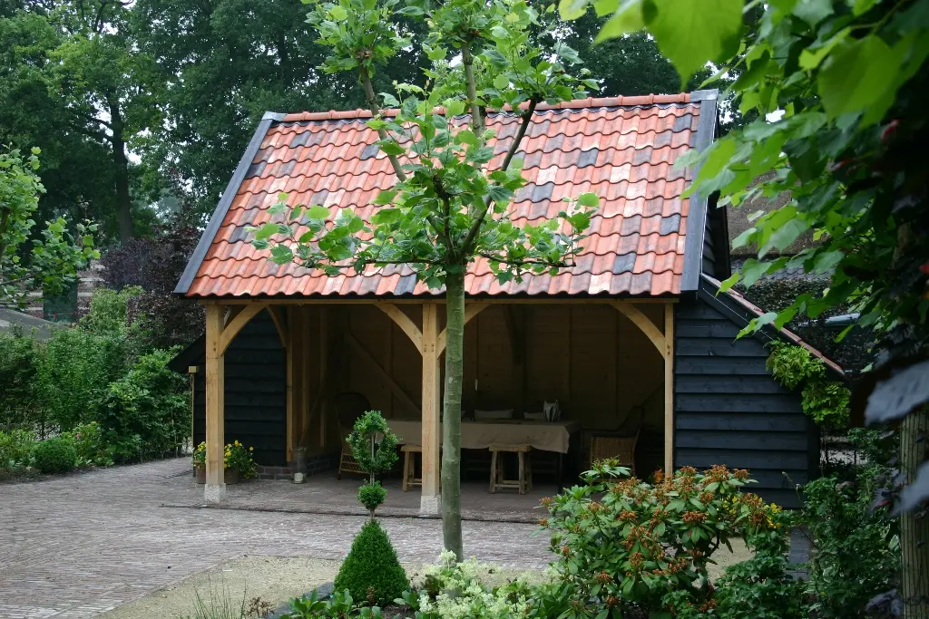 Het eiken bijgebouw met overkapping voorzien van rode cottagepannen en zwarte gevelplanken.