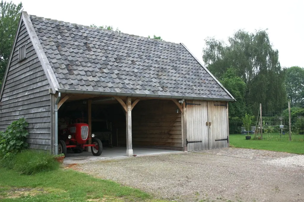 Eiken bijgebouw met carport en garage voor oldtimer tractor en berging, gevel van eiken potdekselwerk.
