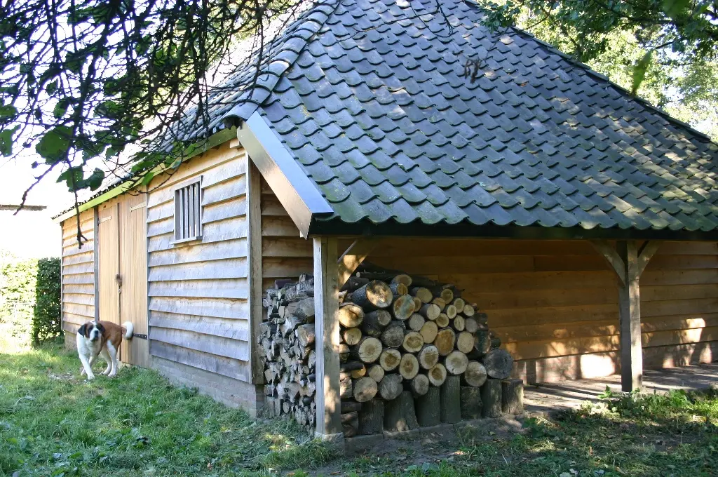 Eiken bijgebouw met dubbele carport en Harley Davidson garage. Gebouw voorzien van eiken houtstek potdeksel gevelbekleding.