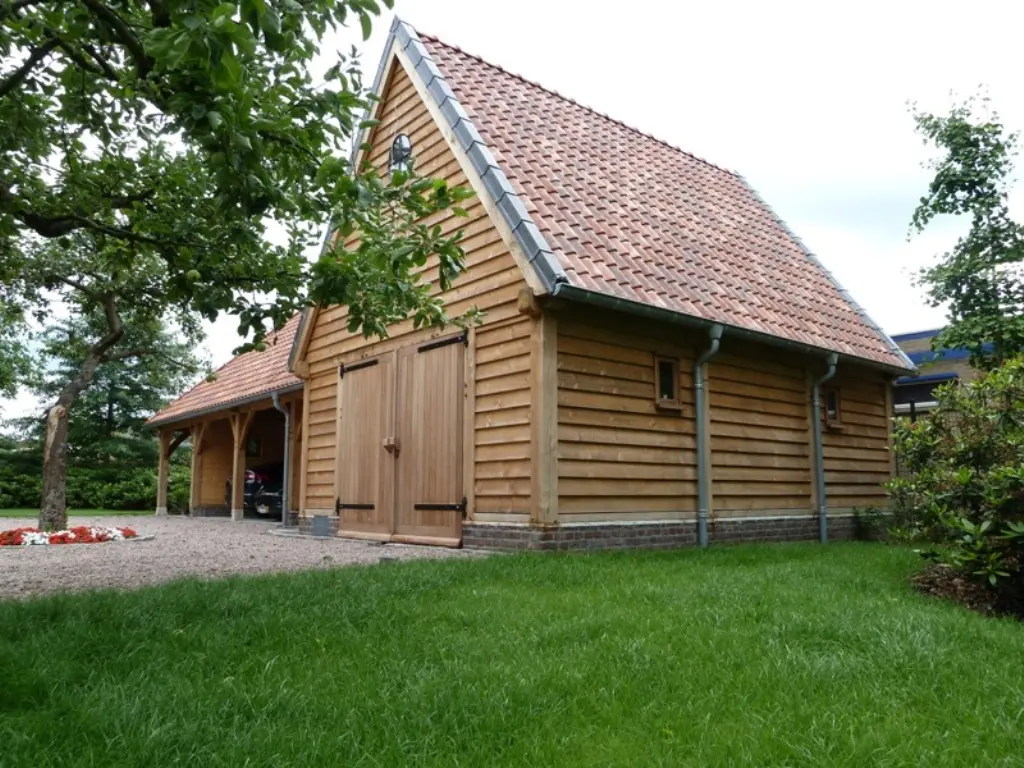 Eiken bijgebouw met carports, jaguar werkplaats en oldtimer stalling. Gebouw voorzien van cottage pannen en eiken potdeksel gevel.