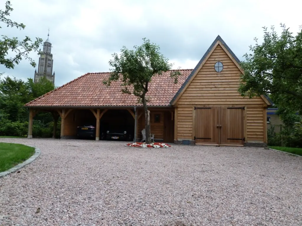 Eiken bijgebouw met carports, Jaguar werkplaats en oldtimer stalling. Gebouw voorzien van cottage pannen en eiken potdeksel gevel.