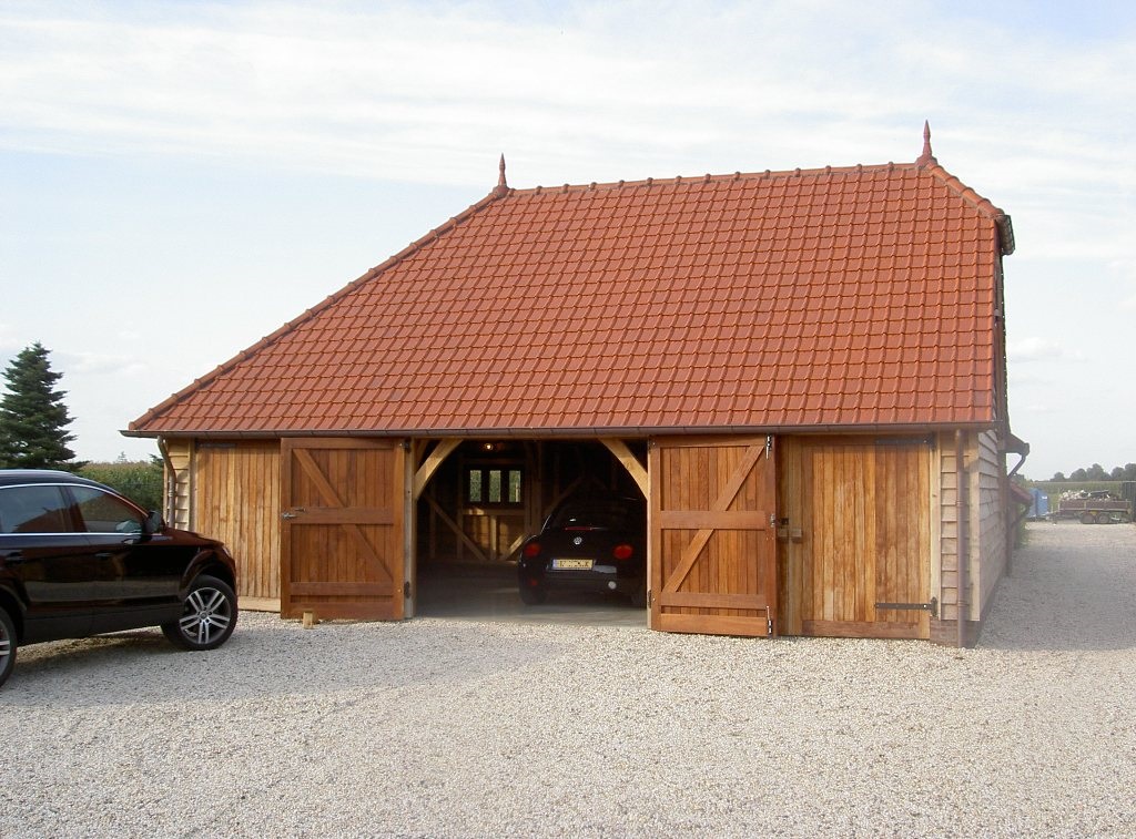 Eiken bijgebouw met garage en tuinkamer voor touareg en kever met rode romaanse panen en drie stel iroko garage deuren.
