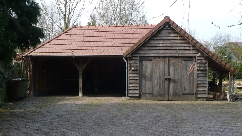 Eiken bijgebouw met dubbele carport en garage, gevel van eiken potdekslewerk.