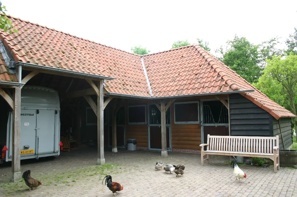 Eiken bijgebouw met 3 stallen en dubbele houten carport en trailer stalling.