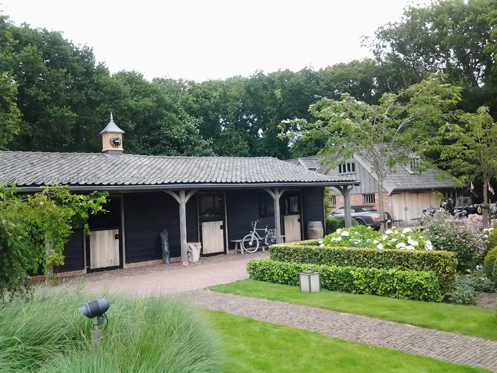 Eiken bijgebouw met stal en eiken gastenverblijf het staldak voorzien van eiken kloktoren gebouwd bij een Kempische villa.