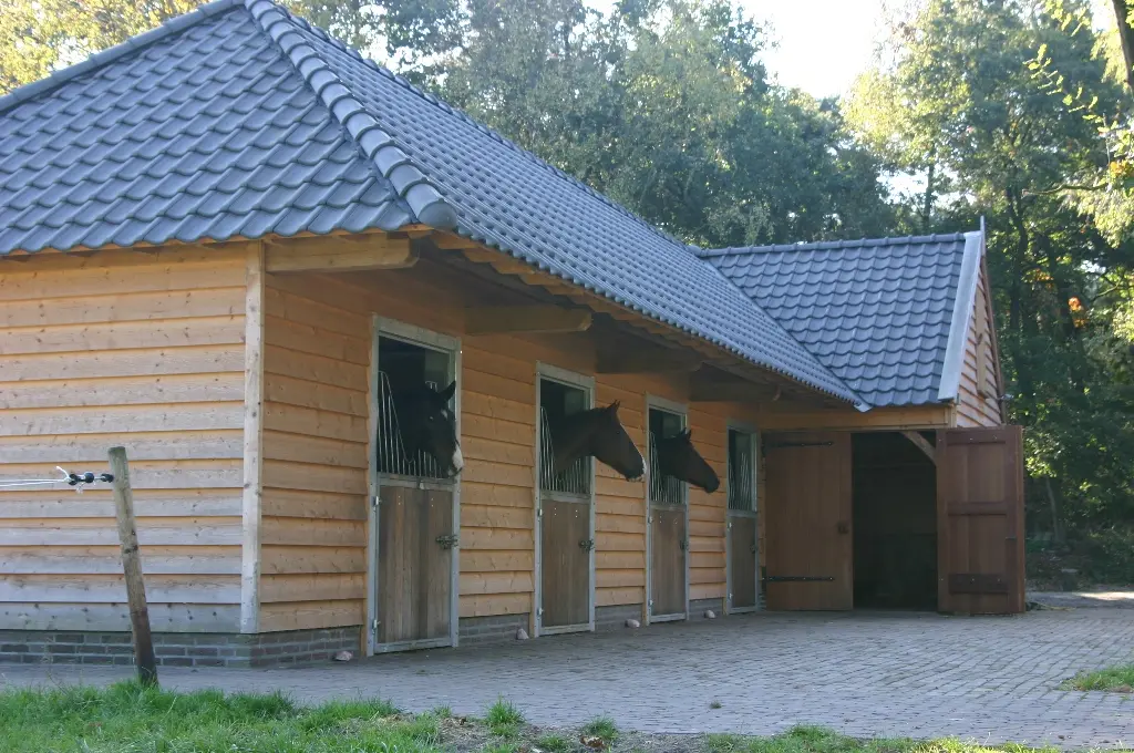 Eiken bijgebouw met stallen en houten carport zadelkamer en hooiopslag.