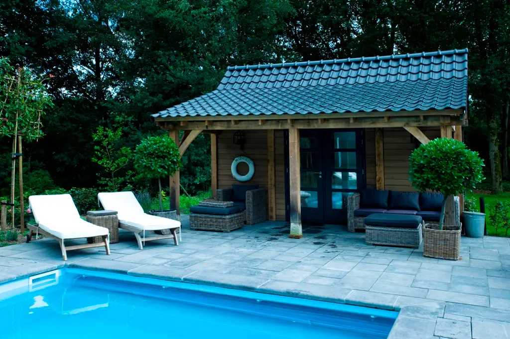 Eiken bijgebouw bij bouwkundig zwembad met houten eiken veranda poolhouse, sauna en techniekruimte.