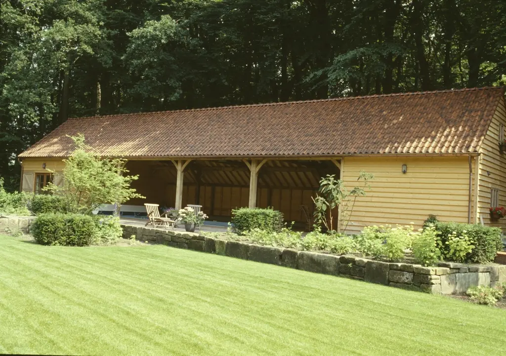 Eiken bijgebouw ter vervanging van bestaande Twentse schuur met gebinten voor zwembadoverkapping gastenverblijf en sauna.