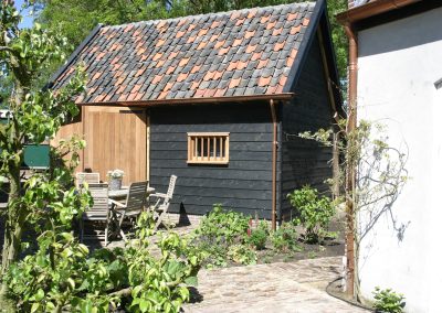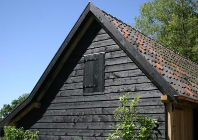 De oude stallen, schuur en de carport zijn gesloopt en weer volledig met nieuwe materialen door ons opgebouwd. Hierbij is gebruik gemaakt van oude hergebruikte gevelstenen, een traditionele eiken constructie en de gebouwen zijn afgewerkt met zwarte potdekselplanken en oude holle dakpannen.