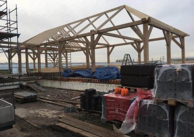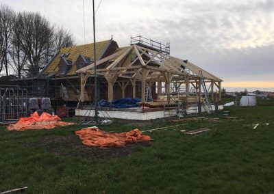 De frames zijn met traditionele verbindingen en eiken doken gemonteerd, het eikenhout wordt geschaafd op de bouwplaats aangeleverd. Voor binnen zijn de hoeken van de eiken onderdelen bewerkt om zo een bekapt uiterlijk te genereren.